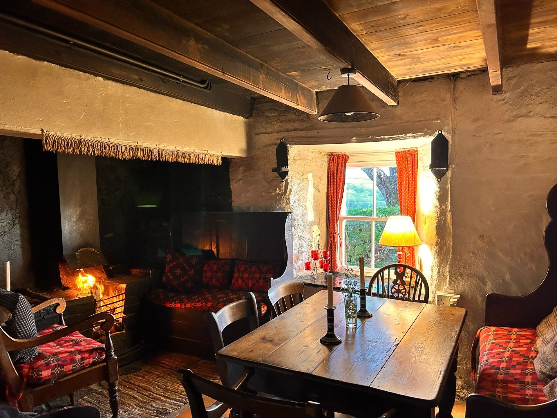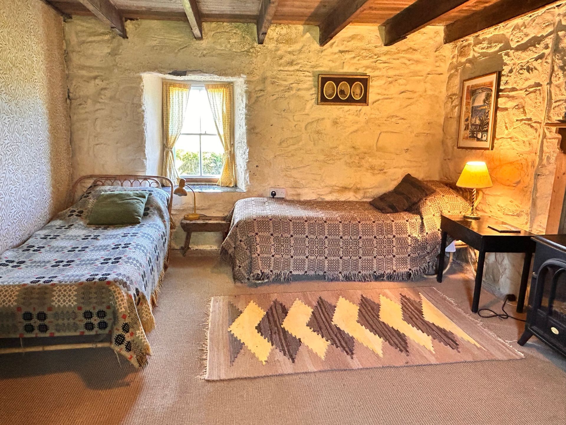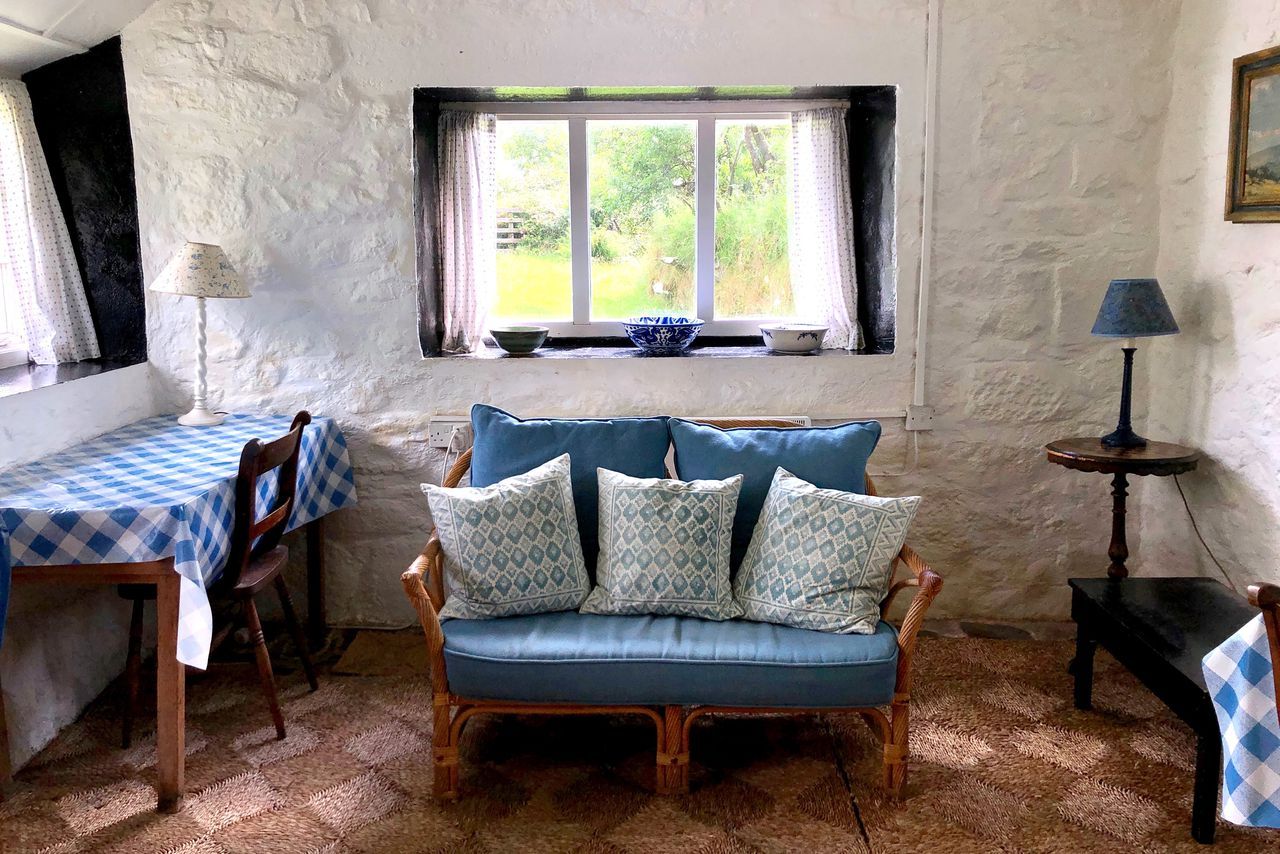 You enter into a stone-floored living room with rush matting, a log-burne and a mishmash of cosy furniture. The kitchen is refreshingly antiquated and cluttered but sweet and serviceable, there’s another living room next door to it with a huge open fire and antique wooden settles. Bedrooms (one downstairs) are plain and unpretentious: books, simple lamps, Welsh blankets, deep window sills, views; bathrooms are fresh.