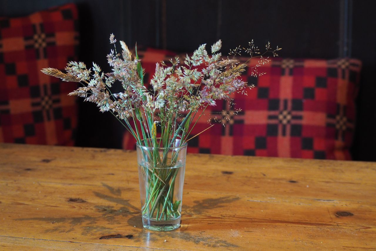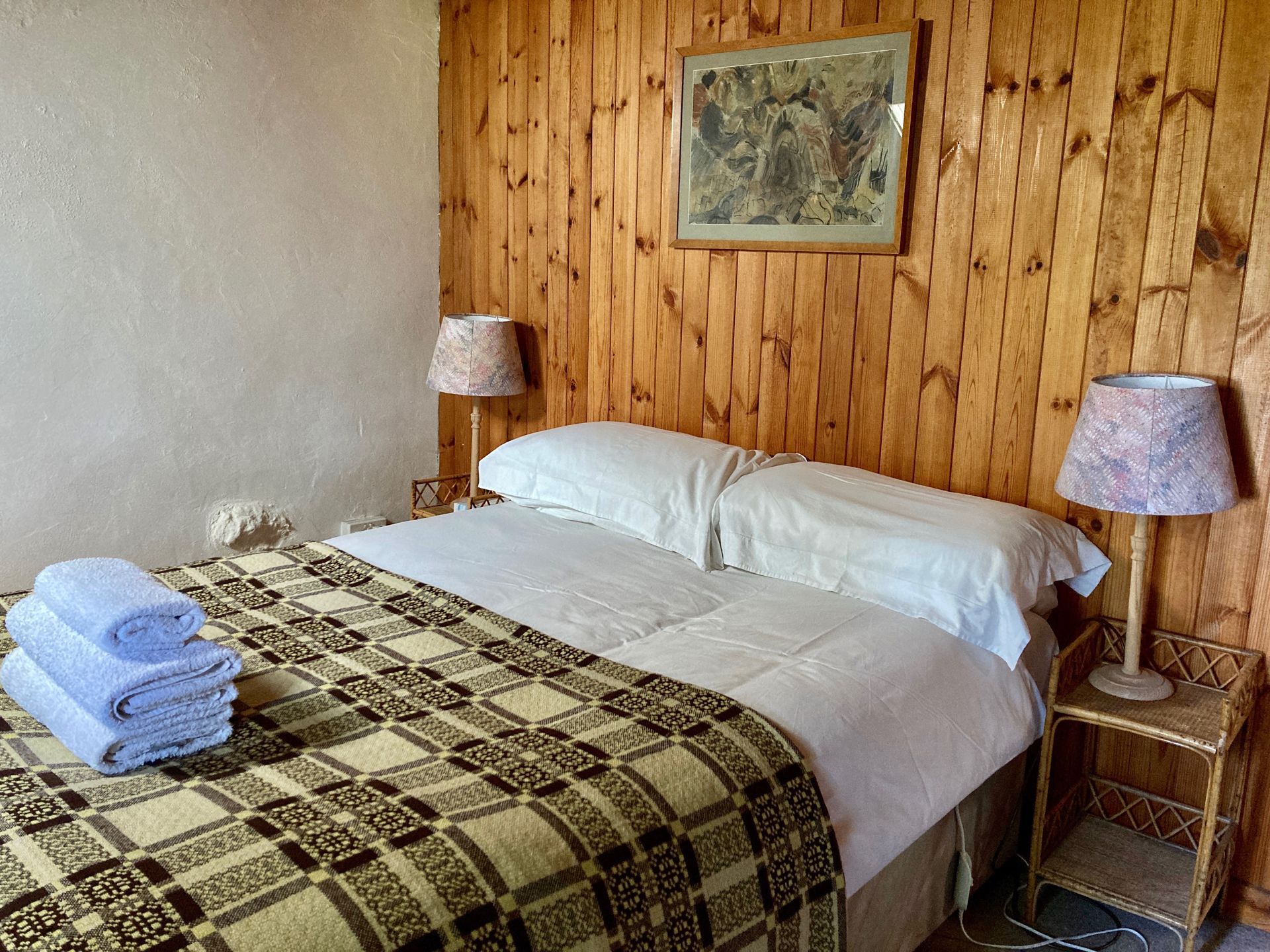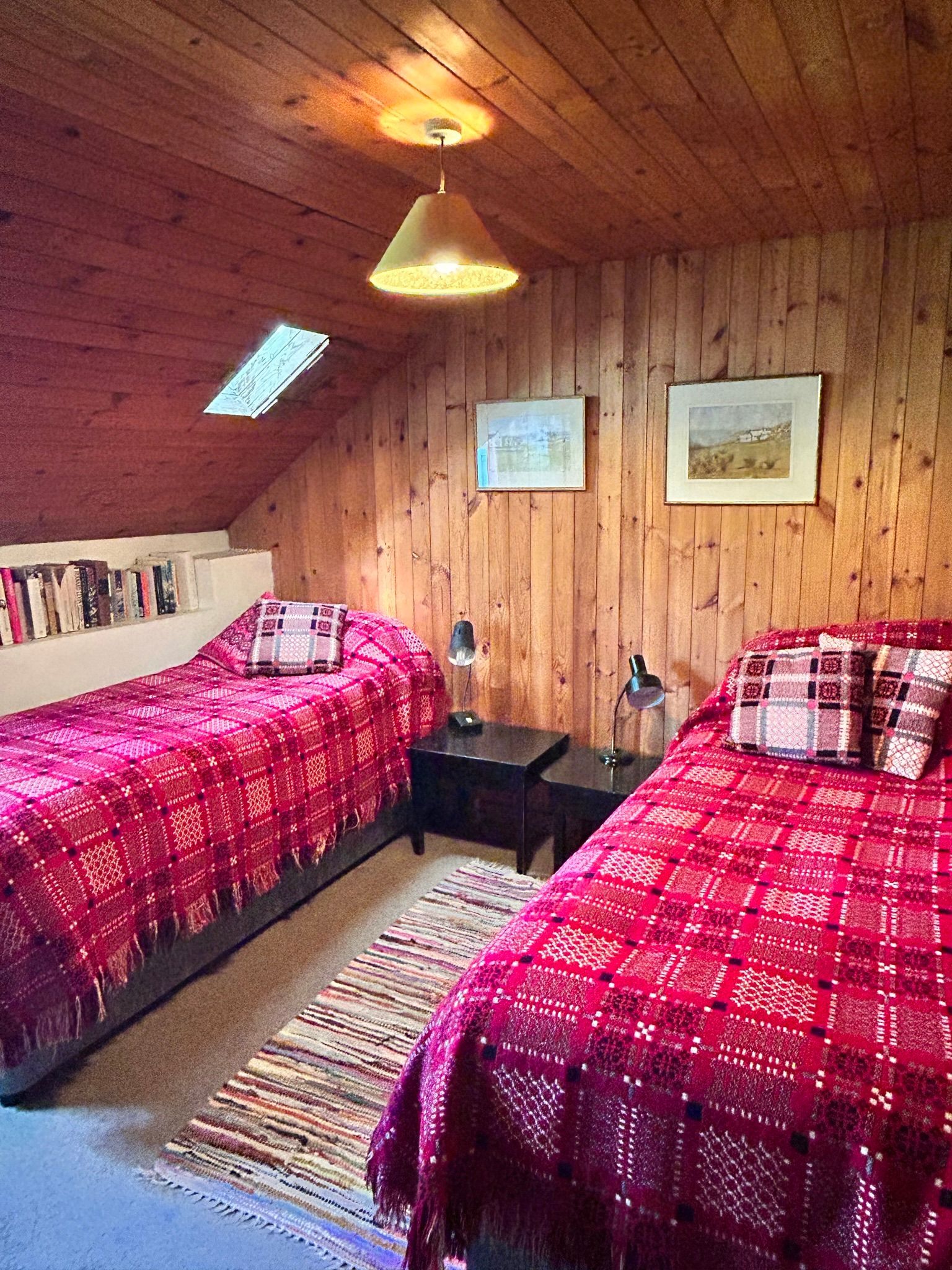 You enter into a stone-floored living room with rush matting, a log-burne and a mishmash of cosy furniture. The kitchen is refreshingly antiquated and cluttered but sweet and serviceable, there’s another living room next door to it with a huge open fire and antique wooden settles. Bedrooms (one downstairs) are plain and unpretentious: books, simple lamps, Welsh blankets, deep window sills, views; bathrooms are fresh.